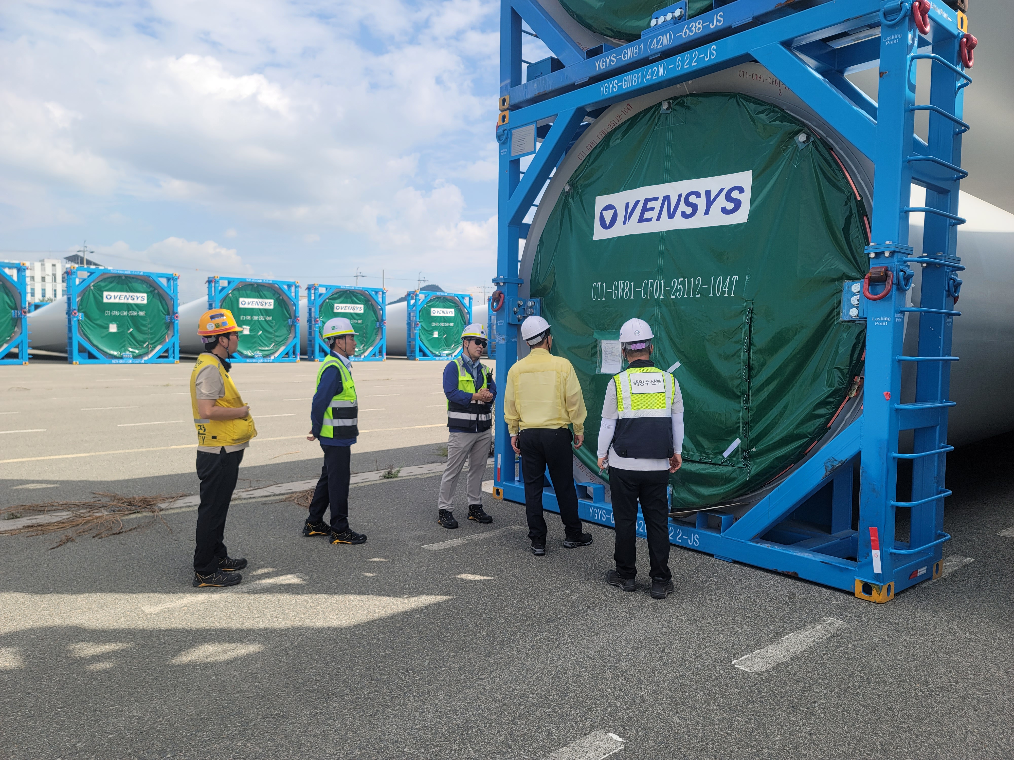 김태환 목포해수청장은 목포신항 다목적부두 낙월해상풍력 하역현장을 찾아 하역장비와 안전장치 작동상태, 작업자 보호구 착용여부 등을 점검했다. 낙월해상풍력은 전남 영광군 낙월면 안마도와 송이도 해상에 풍력시설 364.8MW(5.7MW×64기)를 설치하는 사업으로 내년 하반기까지 목포신항 다목적부두에서 하역한다.(´25. 9. 18.) |